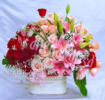Rangkaian cantik dengan vase selendang M, bunga Rose Univers, Rose Red & Lily Pink.