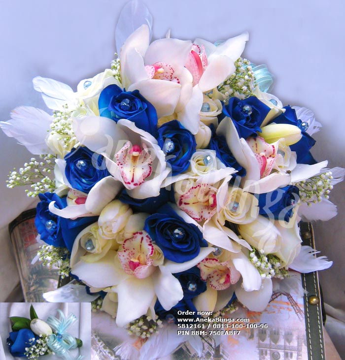 Bouquets Pengantin Rose White, Rose Blue, Tulip White, Symidium White & Baby Breath.